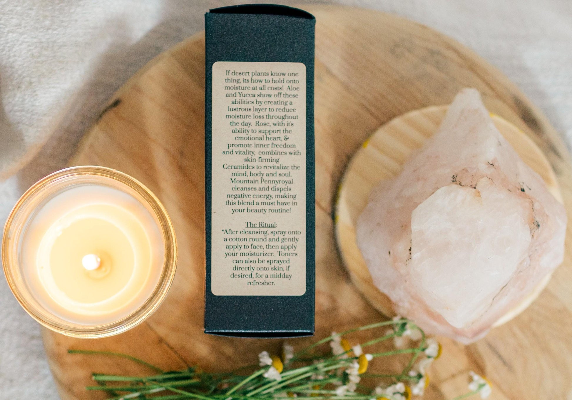 If desert plants know one thing, its how to hold onto moisture at all costs! Aloe and Yucca show off these abilities by creating a lustrous layer to reduce moisture loss throughout the day. Rose, with it's ability to support the emotional heart, & promote inner freedom and vitality, combines with skin-firming