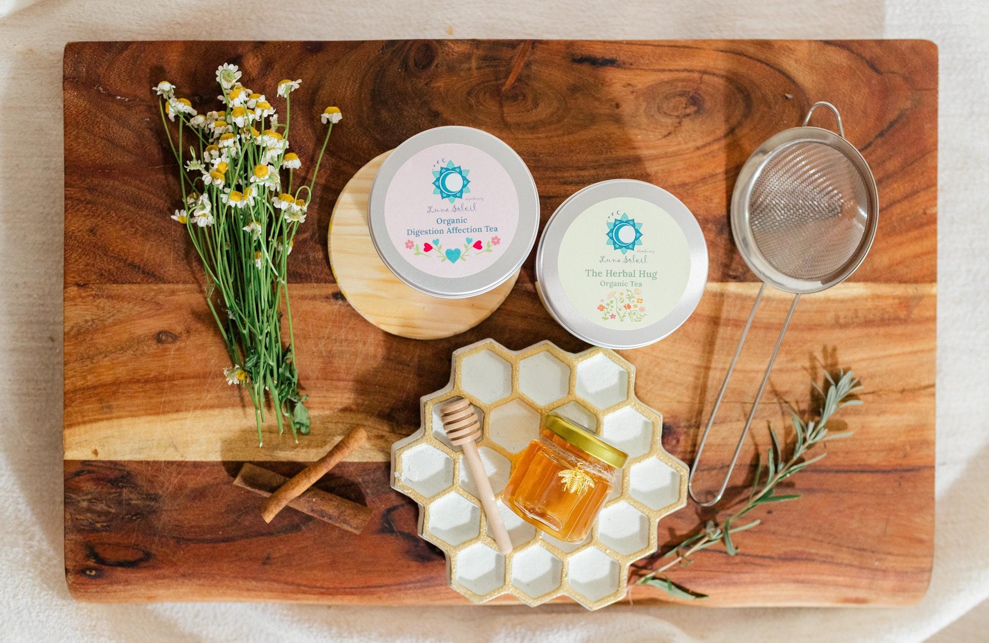 The perfect gift for the tea lover in your life! Your choice of 2 teas (Digestion Affection, Peppermint Peace, Herbal Chill Pill or Herbal Hug) plus a mini jar of honey, complete with a honey spoon and honeybee charm wrapped around the jar, and a tea strainer. This set comes in an 8x8x4 inch kraft brown gift box with a black and white logo stamp.