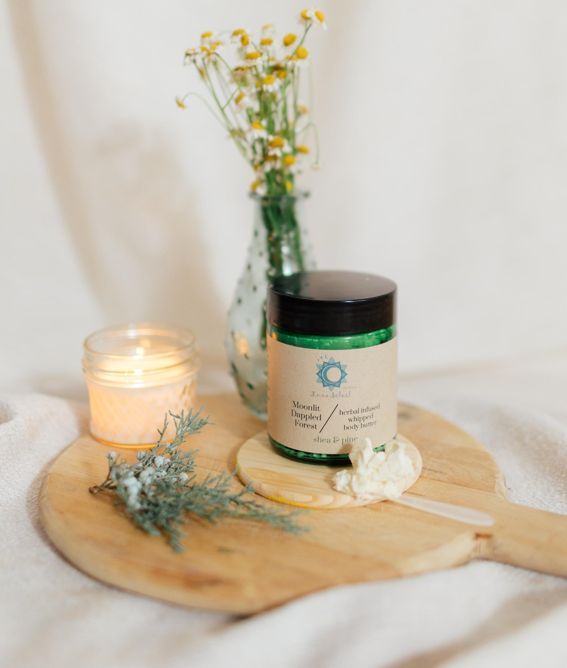 Known for its anti-ageing properties, Evening Primrose oil enriches this nourishing Shea body butter while relaxing Chamomile, Lavender, and Pine calm irritated skin as you sleep and lull you into dreams of misty forests.