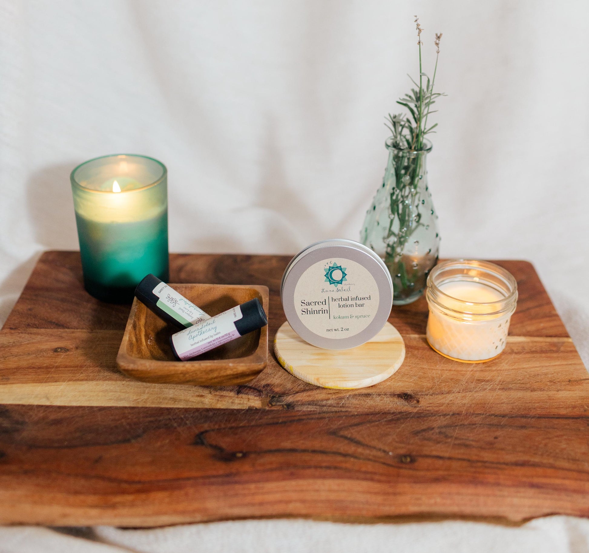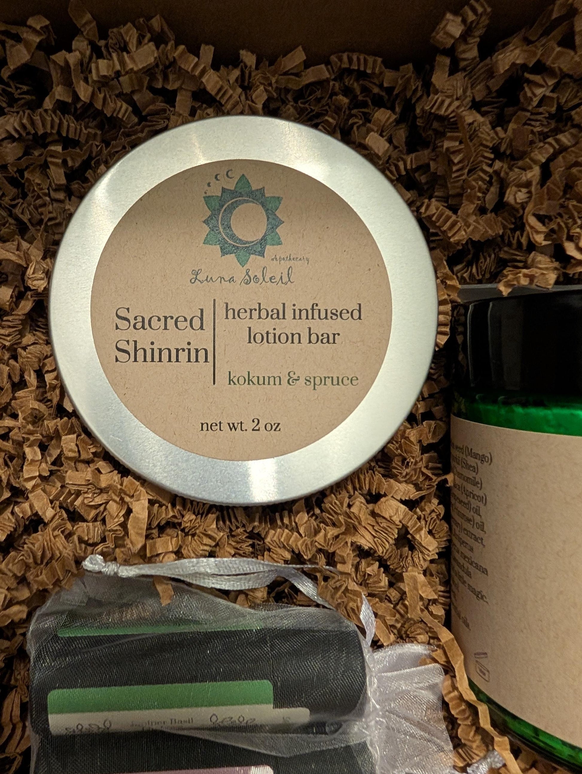"Shinrin," the sacred Japanese ritual of forest bathing, comes to life in this lotion bar enriched with Kokum tree butter, Tamanu oil, and Black Spruce. Skin soothing Plantain combines with Sweet Almond oil to calm irritations and provide maximum moisture.